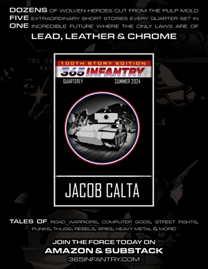 365 Infantry is a quarterly pulp sci-fi webzine set in the dystopian city of Haven and the wild desert of the Wastelands. It’s a post-apocalyptic/cyberpunk future populated by wolves of all shapes and stripes, locked in a terrible battle with Haven’s sentient computer network A.C.E.S. (The Artificially Controlled Eco-System).